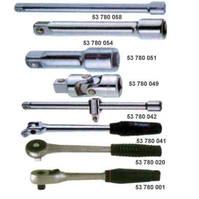 | 產品編號 | 1/2"棘輪扳手及配套附件 規格說明 | | 53780 | | | 53780001 | Umschaltknarre 1/2" 250mm m. Kunststoffgriff, | | 53780020 | Umsteckknarre 1/2" 265mm,Kunststoffgriff und Doppelvierkant | | 53780041 | Gelenkgriff 1/2" | | 53780042 | Schiebegriff 1/2" | | 53780049 | Universalgelenk mit 1/2" Vierkant-Antrieb 75 mm | | 53780051 | Verl?ngerung 1/2", 75mm | | 53780054 | Verl?ngerung mit 1/2" Vierkant-Antrieb 125mm | | 53780058 | Verl?ngerung mit 1/2" Vierkant-Antrieb 250mm |